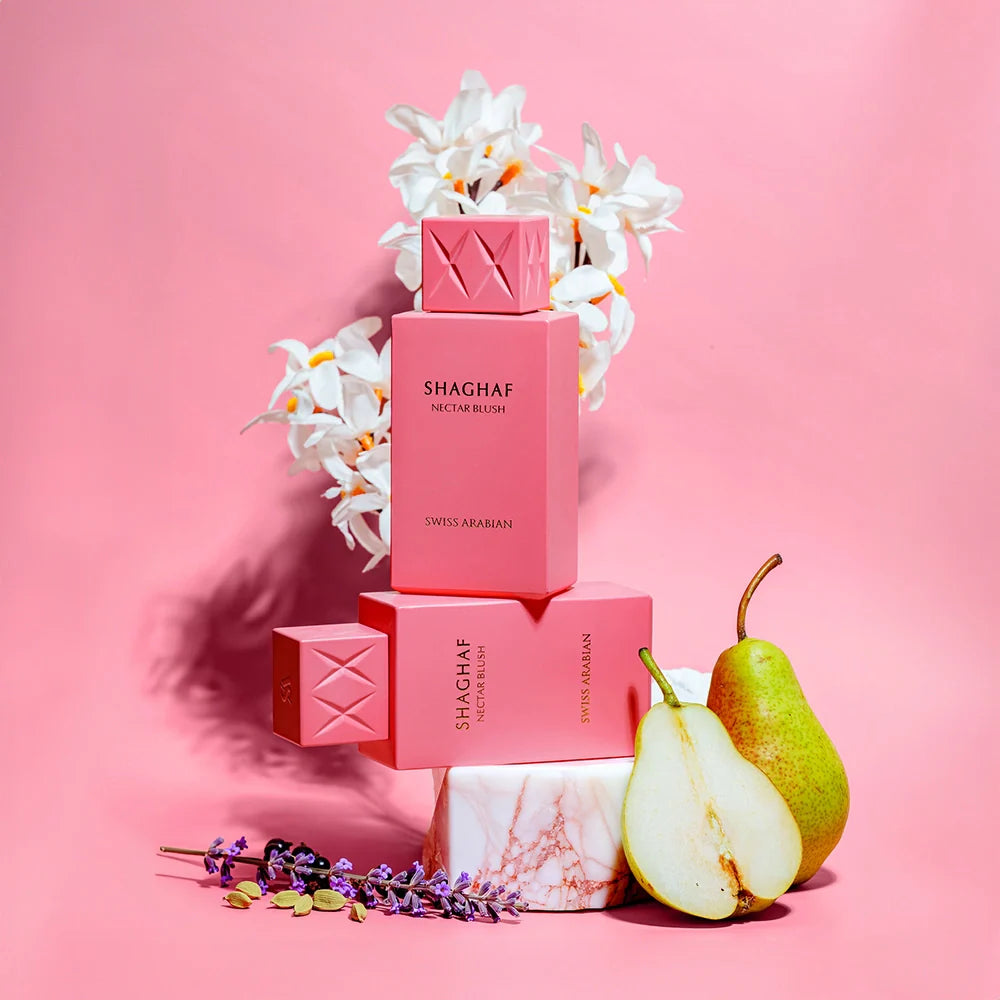 Shaghaf Nectar Blush opens with a radiant sparkle of yuzu, pear, and apple, brightened by neroli, elderflower, and blackcurrant for a luminous, modern freshness. The heart blooms with creamy gardenia, magnolia, and orange blossom, softened by a dewy watery accord and a touch of cedarwood for refined depth. As it settles, patchouli, vanilla, tonka, and musk melt into a warm, sensual trail, wrapped in the gentle sweetness of Peru balsam. Effortlessly sophisticated yet playfully feminine, Shaghaf Nectar Blush captures the essence of modern luxury-a soft, radiant glow that lingers with irresistible charm.
